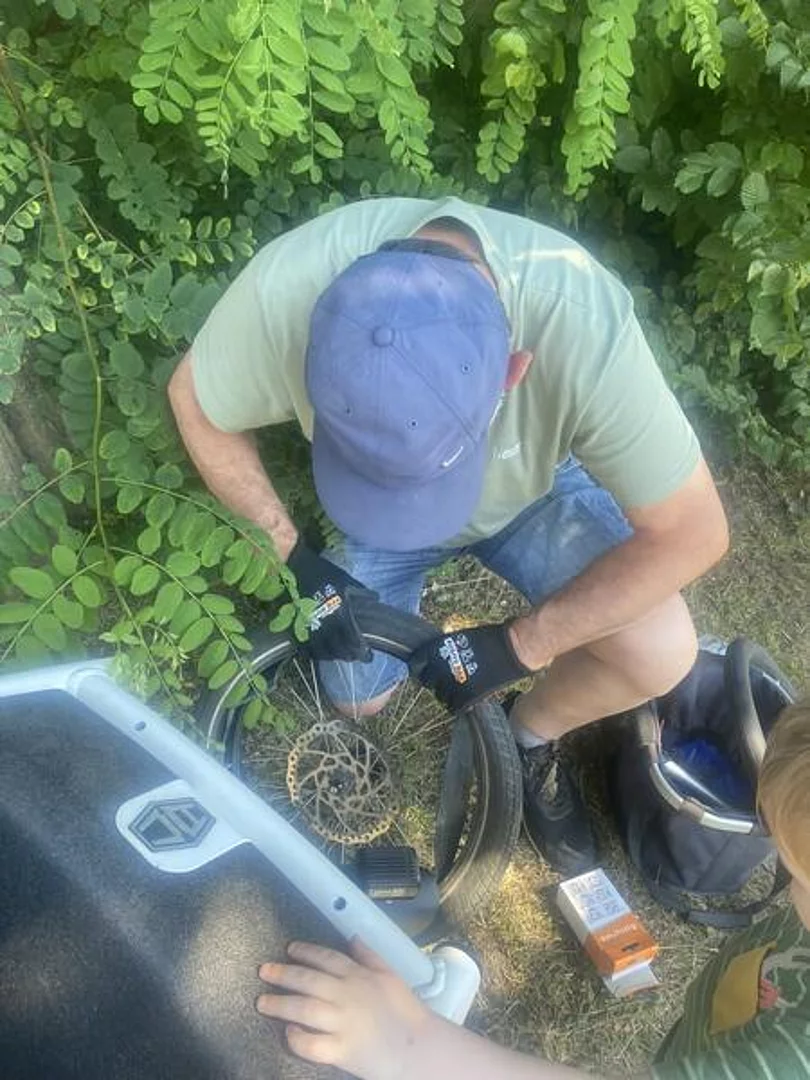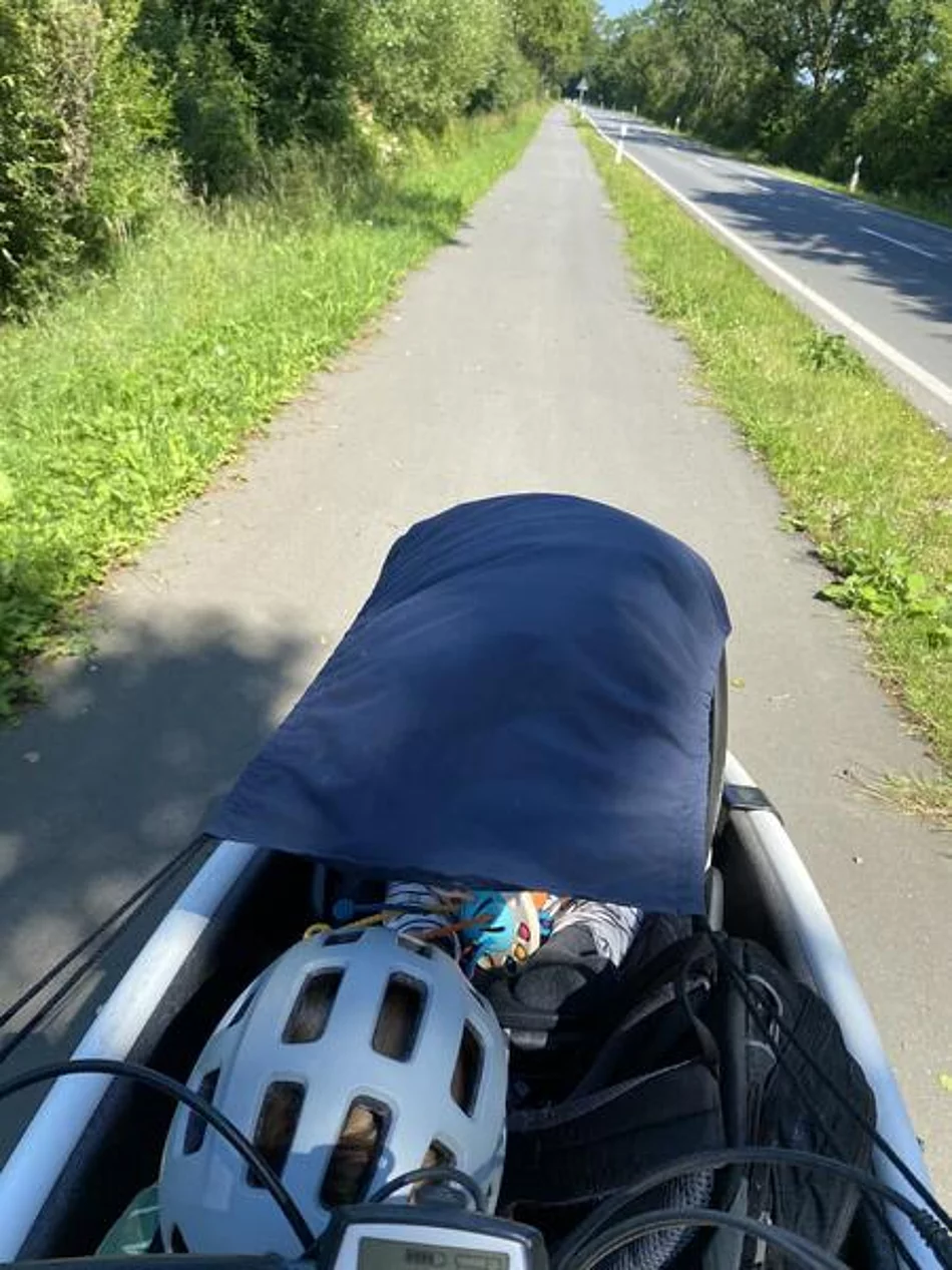 Am Mittwoch stand ein planmäßiger Kinderarzt Besuch im etwa 15 km entfernten Trappenkamp an, welcher natürlich auch mit dem Lastenrad erledigt werden sollte. Die Hinfahrt lief ohne Probleme und mit zwei gut gelaunten Kindern wurde der Arzttermin auch erfolgreich absolviert. Gerade als Florian den Weg zum wohlverdienten Eis starten wollte, bemerkte er wieder einen Plattfuß am gerade reparierten Lastenrad. Florian war also mit zwei Kindern in Trappenkamp gestrandet. Das Dörflein besitzt leider keinen Fahrradladen, sodass erstmal überlegt werden musste, wie man jetzt aus dieser Situation wieder herauskommt.