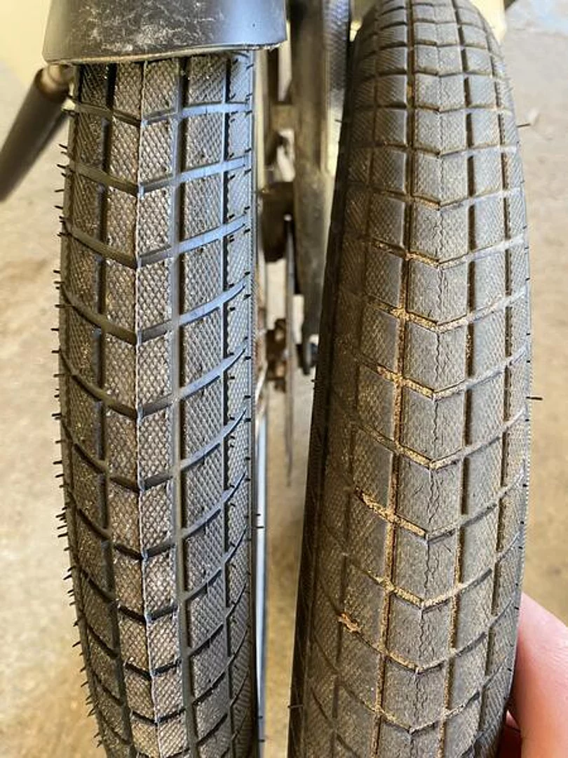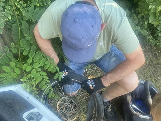 Also wurde Opa als zuverlässiger Pannenhelfer angerufen. Dieser besorgte erst einen neuen Schlauch, schmiss noch Werkzeug und Handschuhe ins Auto und machte sich auf den Weg. Das Rad war im Nu repariert und das Fahrrad wieder startbereit. Anschließend fuhr Florian dann ohne Panne wieder nach Hause. Am nächsten Tag wurde dann ein neuer Mantel gekauft und eingebaut - sicher ist sicher (hätte man sicher auch nach der ersten Panne direkt machen können).
