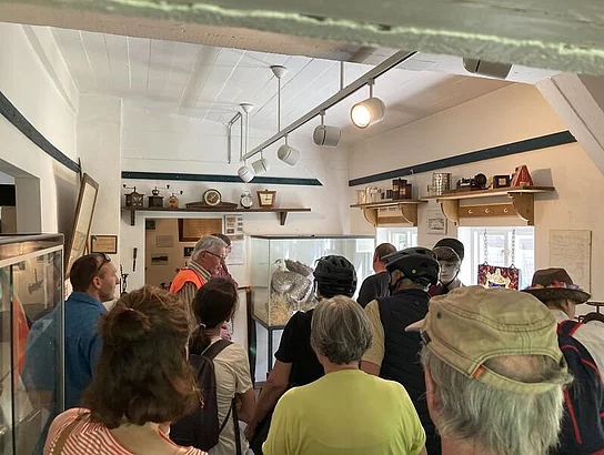 Nach einer gemeinsamen Pause führte Herr Bronsart die Gruppe mit dem Fahrrad durch den Ort, über den Museumsbunker bis hin zur ev.-lutherischen Friedenskirche.