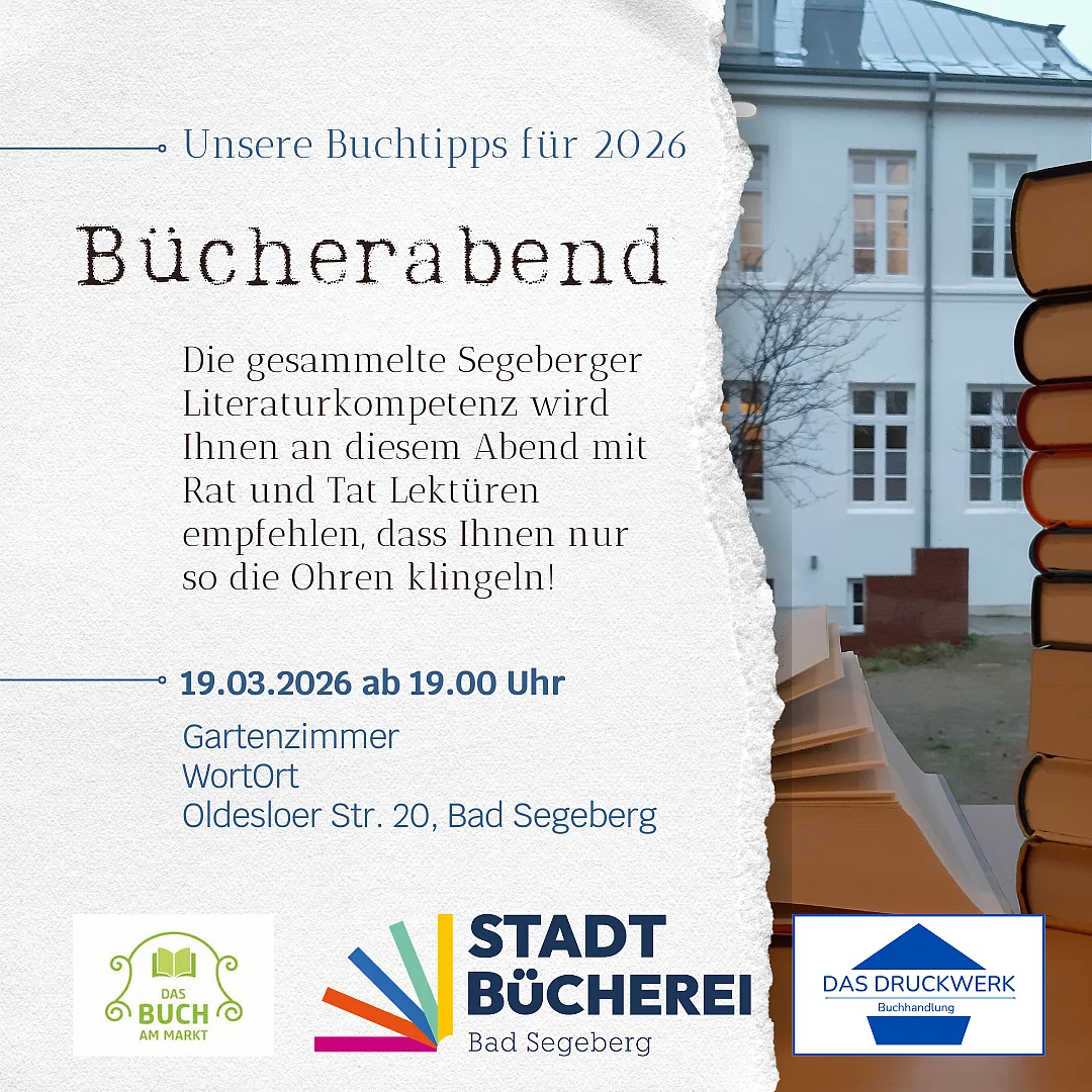 Das neue Bücherjahr ist bereits in vollem Gange. Die Leipziger Buchmesse öffnet ihre Pforten im März. Und Sie wissen immer noch nicht, welche Bücher Sie 2026 begleiten sollen? Keine Sorge! Die gesammelte Segeberger Literaturkompetenz wird Ihnen an diesem Abend mit Rat und Tat Lektüren empfehlen, dass Ihnen nur so die Ohren klingeln!