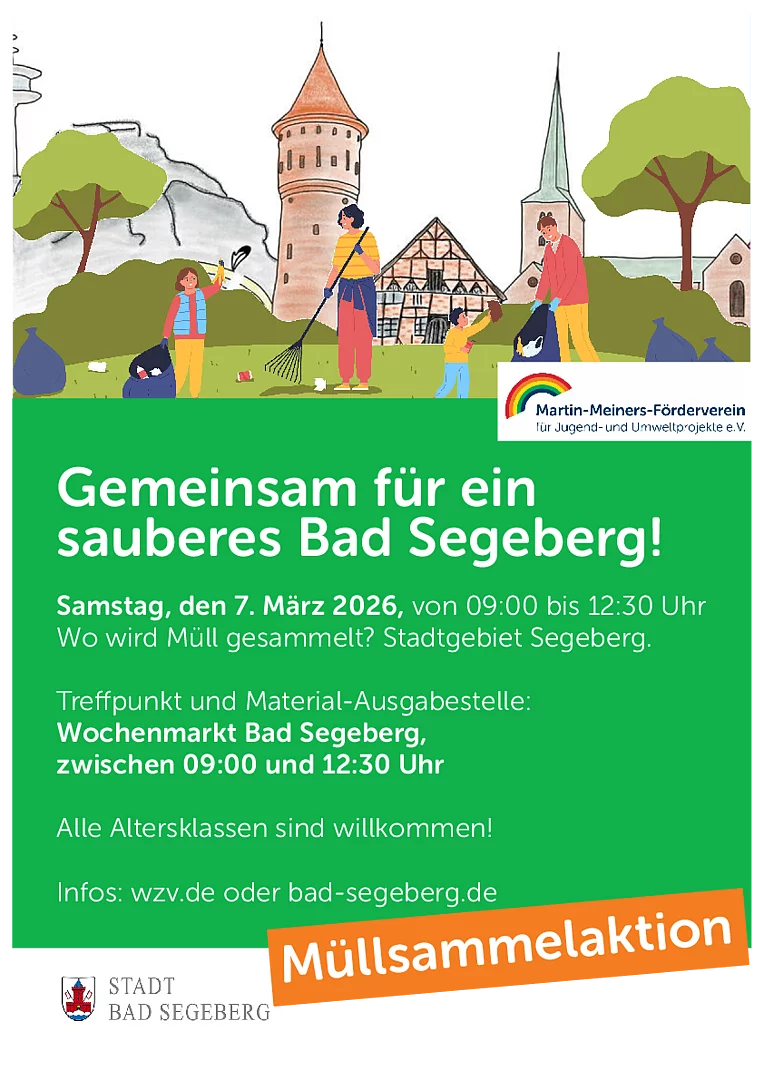Die Stadt Bad Segeberg und der Martin-Meiners-Förderverein des WZV laden zum gemeinsamen Müllsammeln rund um den Marktplatz ein und informieren zu den Themen Mülltrennung und Müllvermeidung.