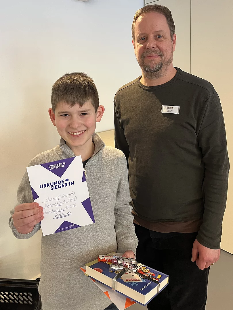 Am Ende setzte sich Bennet Smailus von der Jürgen-Fuhlendorf-Schule in Bad Bramstedt gegen seine Konkurrenz durch und qualifizierte sich mit seiner Lesung aus Der Ruf der Krähen aus der Reihe Die drei ???, vor allem aber seiner souveränen Meisterung des Fremdtextes für die nächste Runde, den Bezirksentscheid. Alle Teilnehmer gewannen Buchpreise.