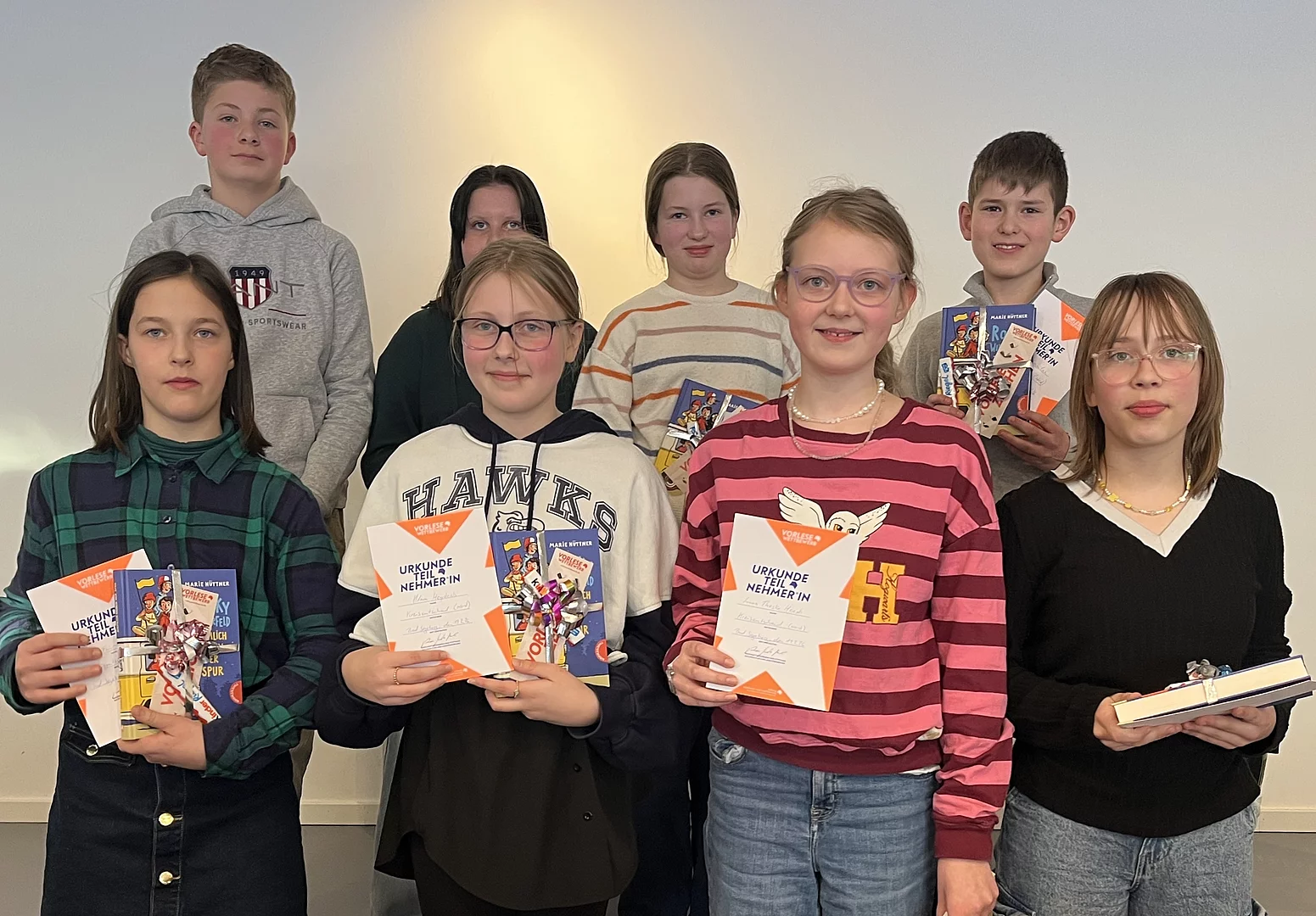 Copyright-Angaben zu den Fotos: Gruppenbild der Teilnehmer und Siegerfoto © Sigrid Gröhn. Eine Einwilligung zur Verwendung der Fotos für Pressezwecke durch die Erziehungsberechtigten liegt der Bücherei vor. Mit im Bild des Siegerfotos: Klaas Ilse von der Stadtbücherei.