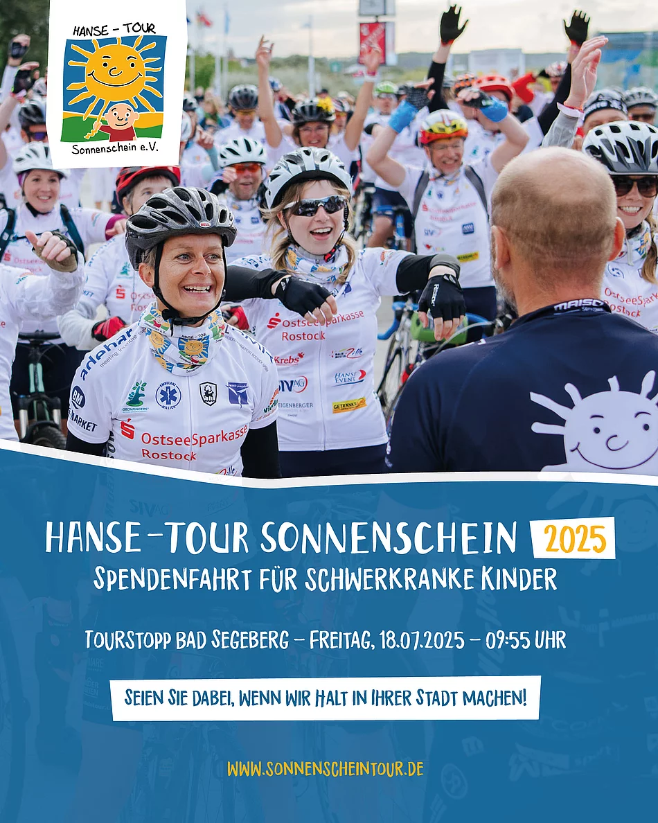 Die Hansetour Sonnenschein ist eine Spendenaktion, die sich zum Ziel gesetzt hat, Projekte zu unterstützen, die krebs- und chronisch erkrankten Kindern und ihren Familien zugutekommen. Der gesamte Erlös der Tour geht zu 100 Prozent in gemeinnützige Projekte, unter anderem in das Projekt „Mike Möwenherz“, an das Universitätsklinikum Schleswig-Holstein (UKSH) sowie in die Tumorforschung an der Universitätsmedizin in Rostock zur Verbesserung der Behandlungschancen für erkrankte Kinder. Die Radfahrerinnen und Radfahrer um Herrn Madsen absolvieren dafür ca. 600 Kilometer in 4 Tagen. Die Route führt sie von Rostock über Kiel zurück nach Warnemünde, wo sie am Samstag zum großen Final erwartet werden.