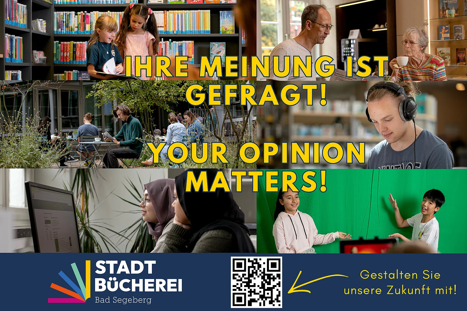 Die Stadtbücherei Bad Segeberg hat sich über die Jahre als zentraler Treffpunkt in der Innenstadt etabliert. Seit 2020 wurde mit dem Medialab das medienpädagogische Angebot für Kinder, Jugendliche und Erwachsene stark ausgebaut. Aktuell denken wir über einen Ausbau der „Bibliothek der Dinge“ (Ausleihe von selten gebrauchten Gegenständen wie Nähmaschine oder Beamer), den Umbau zur Open Library (Längere servicefreie Öffnungszeiten) und neue Veranstaltungsformate nach. Dazu möchten wir Ihre Meinungen, sowohl der Nutzenden und Nicht-Nutzenden, einholen, um auf dieser Grundlage die richtigen Entscheidungen für die Zukunft Ihrer Bücherei zu treffen. Bitte nehmen Sie sich ca. 10 Minuten Zeit zum Beantworten der Umfrage und entscheiden Sie mit. Wir freuen uns über jede Rückmeldung.