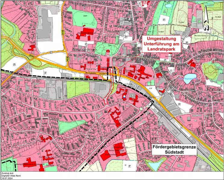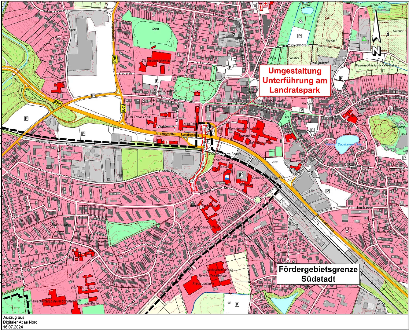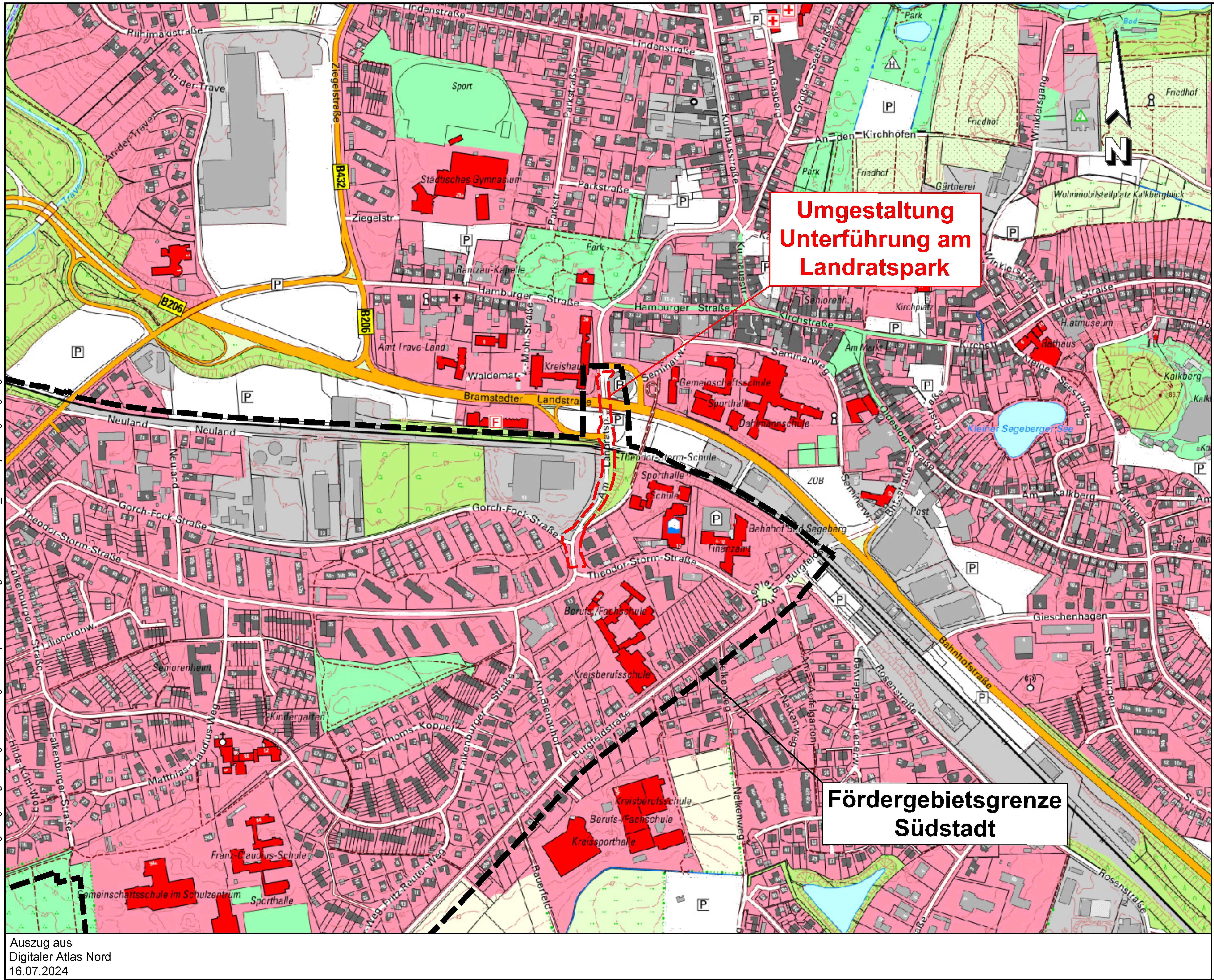 Bei der Unterführung am Landratspark handelt es sich um den nördlichen Eingangsbereich in die Südstadt. Dieser umfasst die Unterführung der vierspurigen Bundesstraße B 206 mit den angrenzenden Verkehrsflächen „Am Landratspark“ bis zu der Kreuzung Theodor-Storm-Straße.